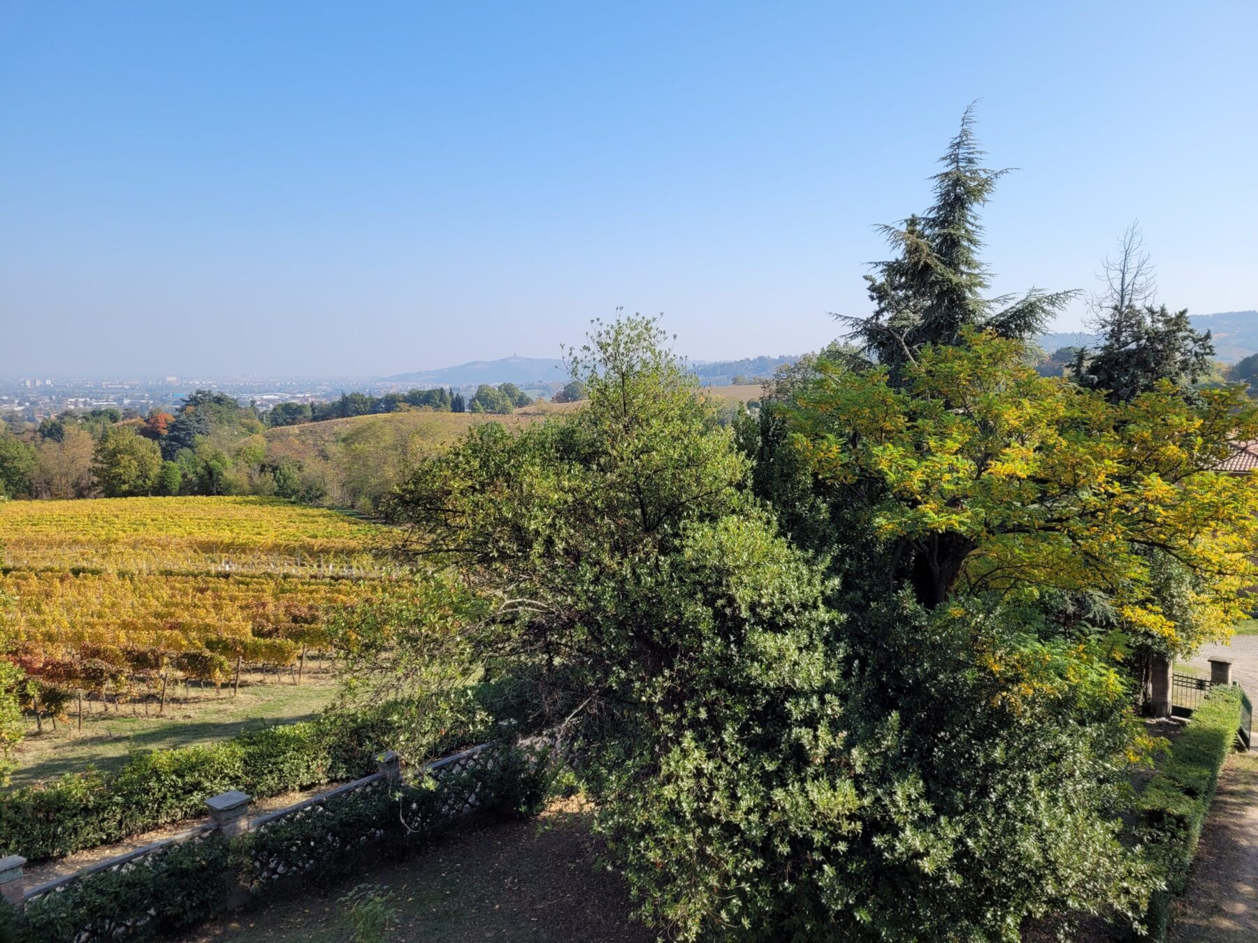 Ore 18.45: partenza per passeggiata a piedi fra le vigne (15 minuti) per arrivare in cima al Parco di Villa Virginia, all’interno della proprietà, da cui si gode uno sconfinato panorama verso Bologna a est e tutta la pianura fino a Modena verso nord ovest.